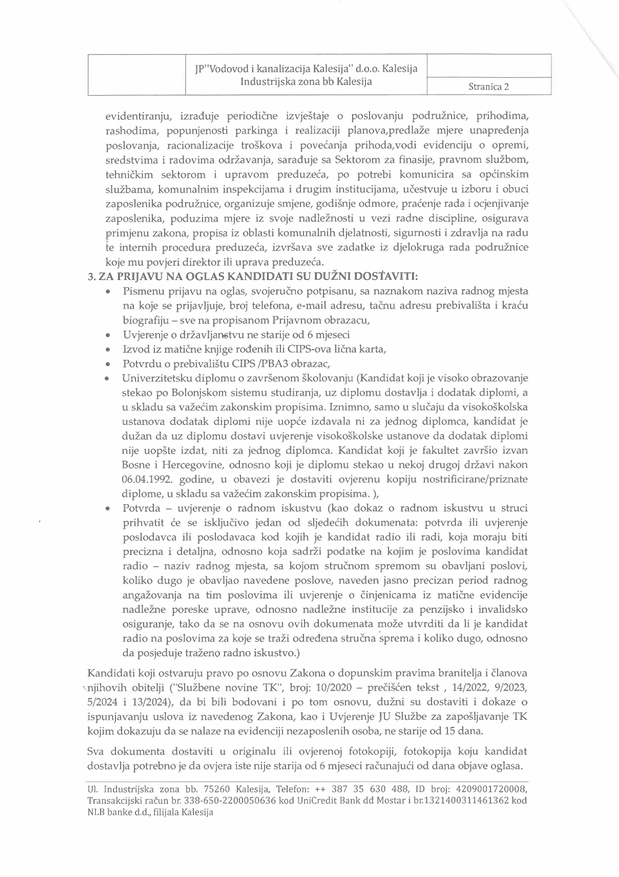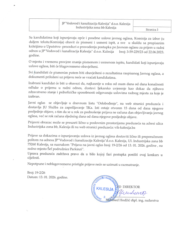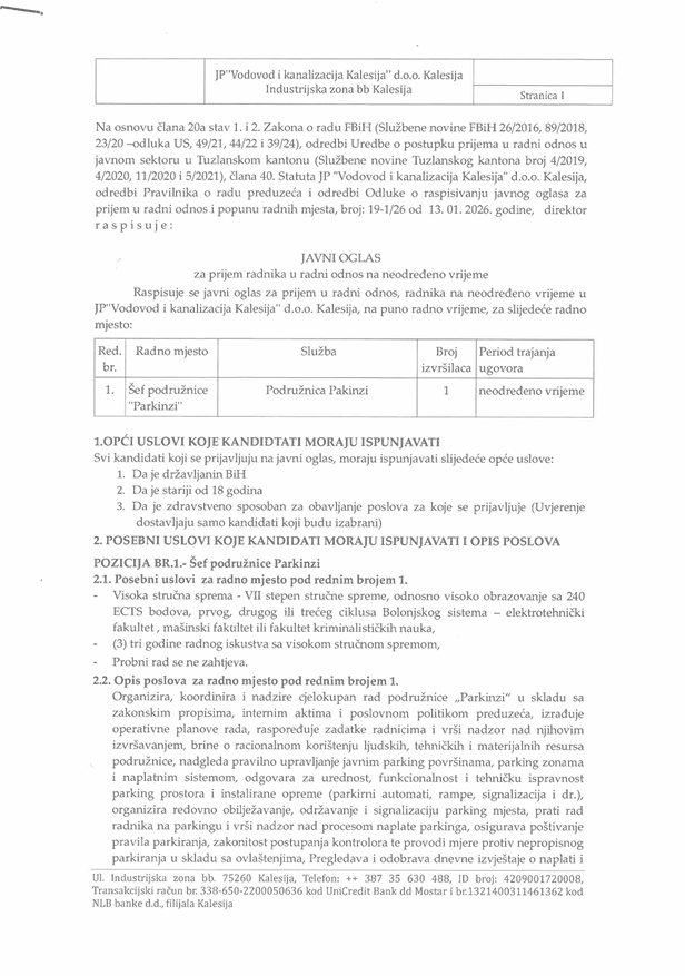 JP “Vodovod i kanalizacija Kalesija” objavilo je javni oglas za prijem radnika u radni odnos na neodređeno vrijeme na radno mjesto – Šef podružnice “Parkinzi” (1 izvršilac na neodređeno vrijeme).