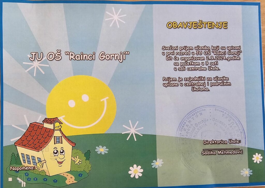 Svečani prijem učenika koji su upisani u prvi razred JU OŠ “Rainci Gornji” bit će organizovan 2.9.2024. godine sa početkom u 9 sati u sali centralne škole.