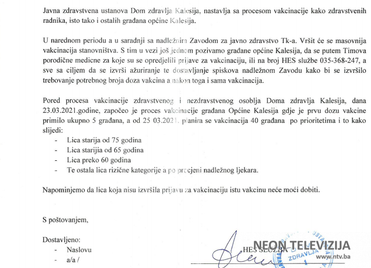 Javna zdravstvena ustanova Dom zdravlja Kalesija nastavlja sa procesom vakcinacije kako zdravstvenih radnika, isto tako i ostalih građana općine Kalesija.