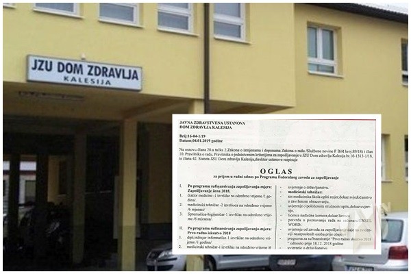 Javna zdravstvena ustanova Dom zdravlja Kalesija objavila je Javni konkurs za prijem u radni odnos. Javni konkurs objavljen je u Oslobođenju, 6.1.2019.godine. Prijave se dostavljaju u roku od osam dana od dana objavljivanja oglasa.