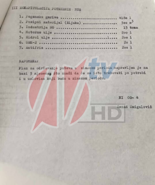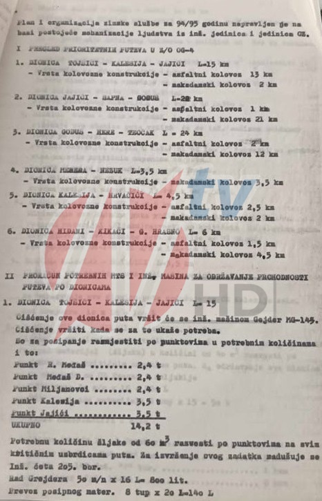 Riječ je o Planu održavanja puteva u zimskom periodu na području zone odgovornosti Operativne grupe 4, nastalom u oktobru 1994. godine, kojim je vrlo precizno definisan raspored i način održavanja i čišćenja puteva u zimskoj sezoni 1994/95.