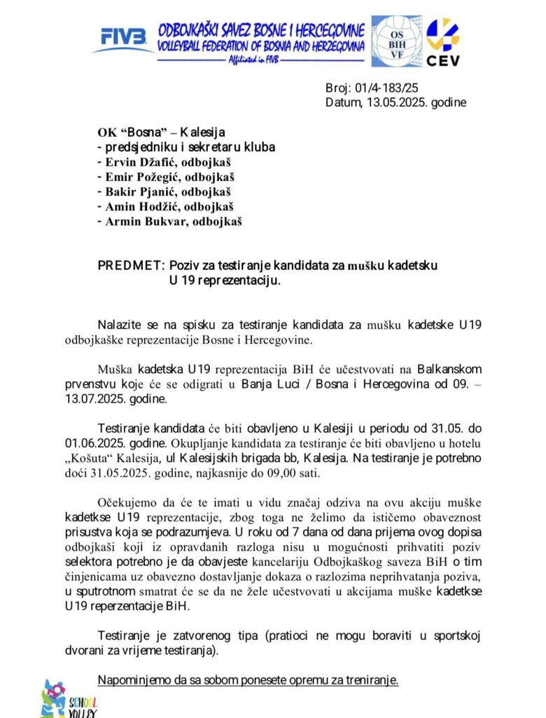 – Okupljanje kandidata za testiranje će biti obavljeno u hotelu ,,Košuta” Kalesija, Na testiranje je potrebno doći 31.05.2025. godine, najkasnije do 09,00 sati. Očekujemo da će te imati u vidu značaj odziva na ovu akciju muške kadetske U19 reprezentacije, zbog toga ne želimo da ističemo obaveznost prisustva koja se podrazumjeva. U roku od 7 dana od dana prijema ovog dopisa odbojkaši koji iz opravdanih razloga nisu u mogućnosti prihvatiti poziv selektora potrebno je da obavijeste kancelariju Odbojkaškog saveza BiH o tim činjenicama uz obavezno dostavljanje dokaza o razlozima neprihvatanja poziva, u sputrotnom smatrat će se da ne žele učestvovati u akcijama muške kadetske U19 reperzentacije BiH – navedeno je iz Saveza.