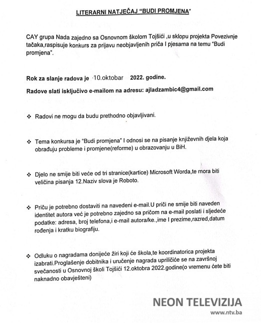 CAY grupa “Nada” zajedno sa OŠ “Tojšići” raspisuje literarni natječaj za neobjavljene priče i pjesme na temu “Budi promjena”. Literarni natječaj se raspisuje u sklopu projekta “Povezivanje tačaka”, kojeg realizuju World Vision BiH i Naša djeca Sarajevo.