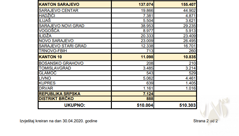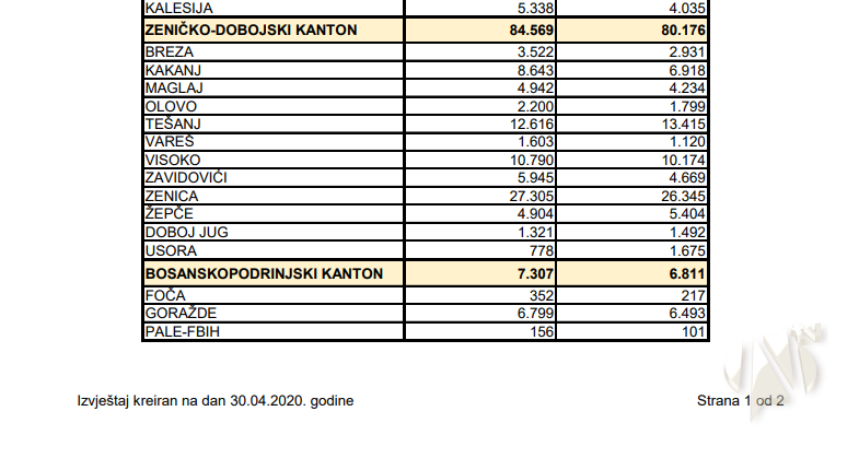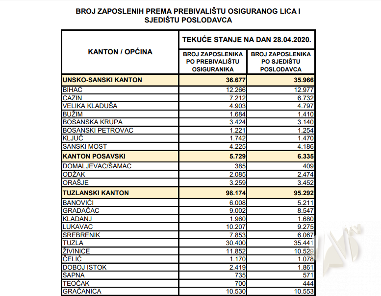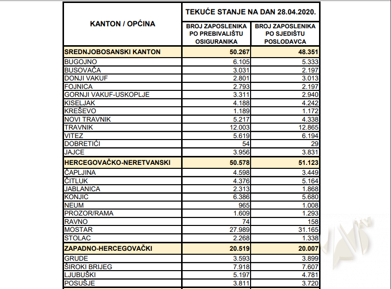 U tabelarnom pregledu koji slijedi daje se pregled stanja broja zaposlenih radnika po kantonima i općinama na dan 28.04.2020. godine, na linku http://pufbih.ba/v1/public/upload/files/zaposleni_za_WEB_na_dan_28_04_2020.pdf .