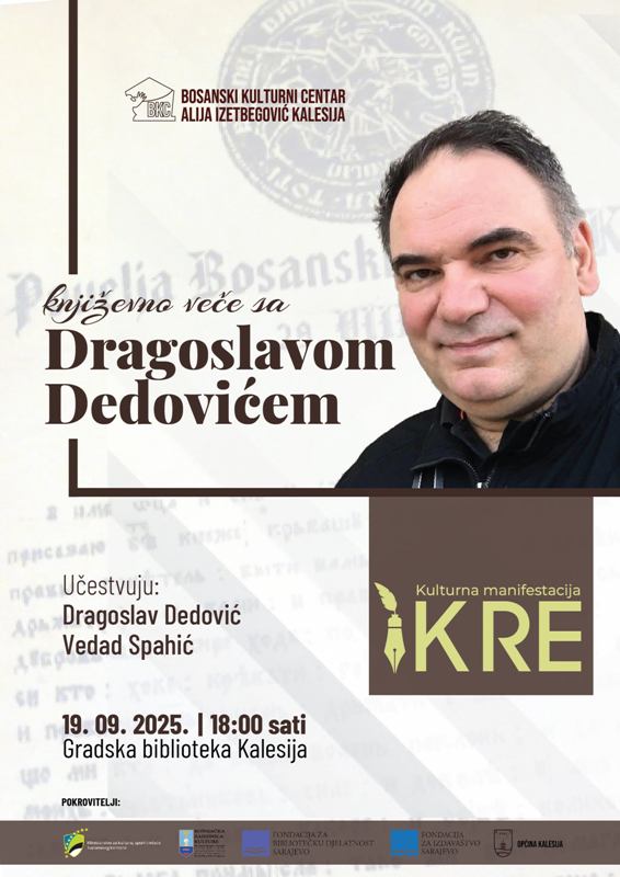 Narednog petka, 19. oktobra, s početkom u 18,00 sati, u prostoru kalesijske “Gradske bibliotke”, održat će Književno veče s Dragoslavom Dedovićem. Osim Dragoslava Dedovića, učestvovat će i prof. Dr Vedad Spahić, književni kritičar i profesor na Filozofskom fakultetu u Tuzli, koji će govoriti o književnom radu Dragoslava Dedovića.
