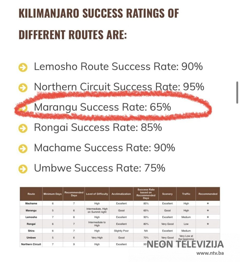Naime, Marangu ruta ima najmanju izlaznost na vrh radi kratkog vremena aklimatizacije, te iznosi do 65% uspješnosti, što ovaj uspjeh čini još većim. Svi učesnici su ozbiljno pristupili ovom usponu i vrijedno su se spremali duži vremenski period da bi ostvarili svoje snove i zahvalili se planini što im je dopustila da se popnu na vrh.