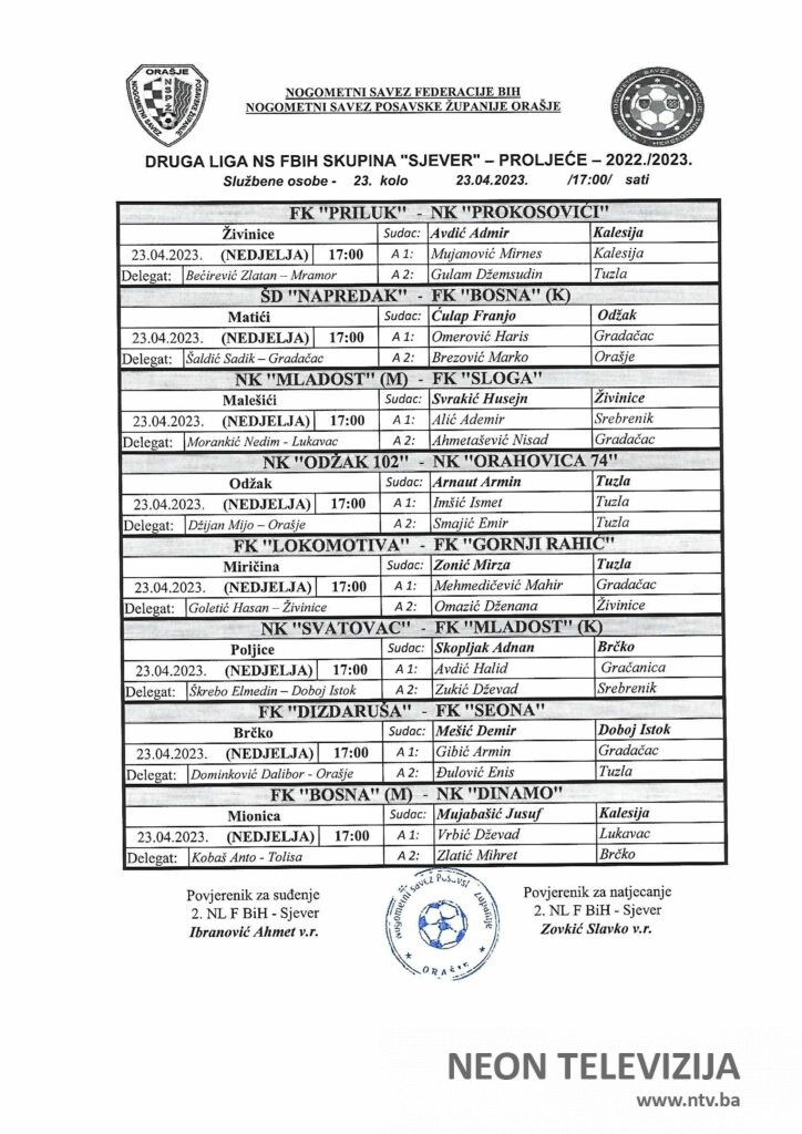 Sve utakmice 23.kola igraju se sutra, u nedjelju, 23.aprila, sa početkom u 17 sati.