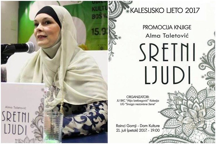 U petak, 21. jula, sa početkom u 19,00 sati, u sali Doma kulture u Gornjim Raincima, u okviru manifestacije „Kalesijsko ljeto 2017“, bit će upriličena promocije knjige „Sretni ljudi“ autorice Alme Taletović. Organizatori promocije su JU BKC „Alija Iizetbegović“ Kalesija i UG „Snaga nezavisne žene“. Osim autorice, o knjizi će govoriti i Sumeja Sandra Đurić.