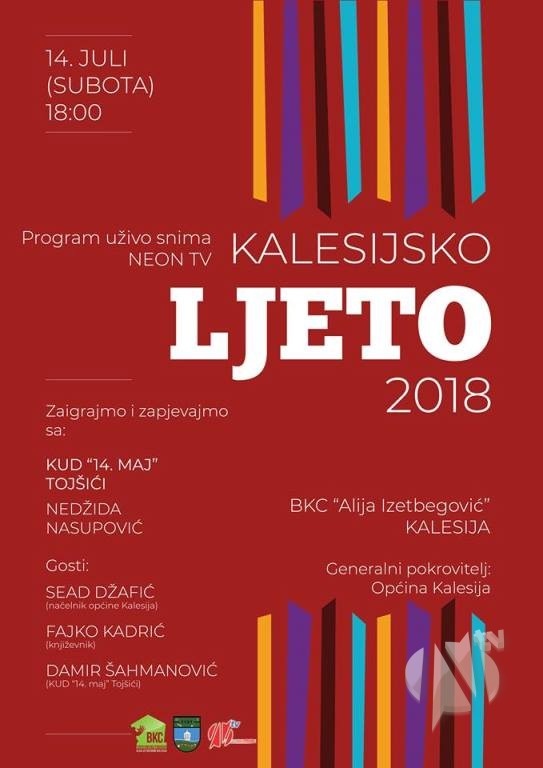 Kulturno-zabavna manifestacija „Kalesijsko ljeto 2018“ počinje u subotu 14. jula. Manifestacija će se održavati svake subote tokom jula i avgusta mjeseca. Prve večeri kalesijskoj publici će se predstaviti KUD „14. maj“ Tojšići i Nedžida Nasupović. Program, na otvorenom, ispred zgrade BKC-a, pod nazivom „Zaigrajmo i zapjevajmo sa KUD „14. maj“ Tojšići i Nedžidom Nasupović“, počet će u 18,00 sati.