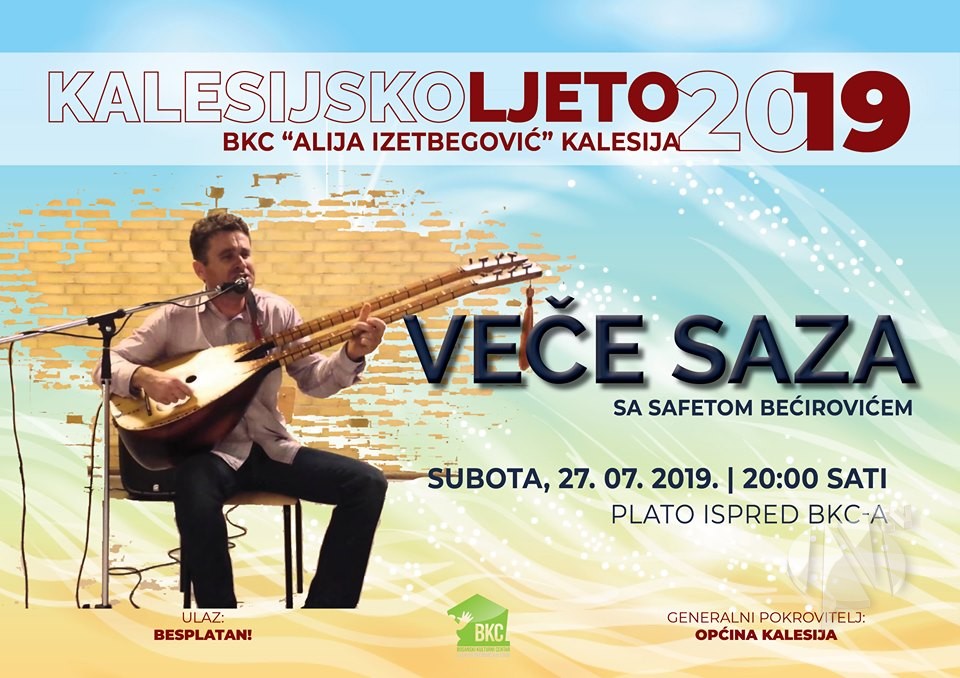 U okviru kulturno-zabavne manifestacije „Kalesijsko ljeto 2019“, u subotu, 27. jula, na rasporedu je Veče sevdaha uz saz i Safeta Bećirovića. Program počinje u 20,00 sati, ispred kalesijskog BKC-a.