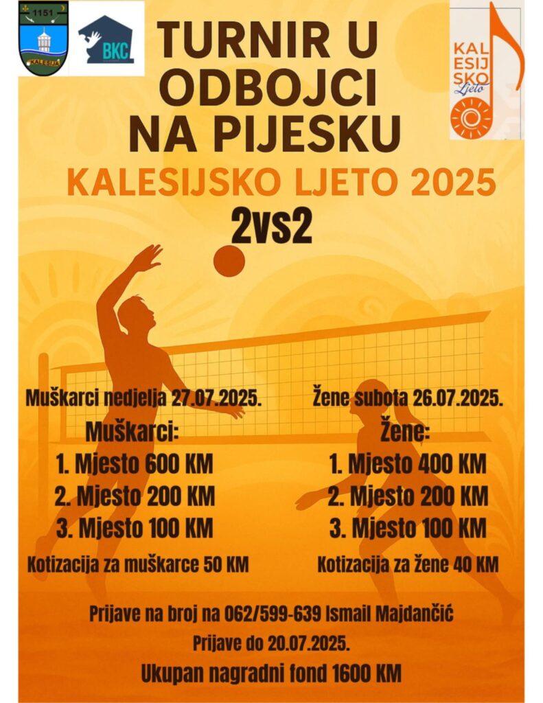 U sklopu kulutrno-zabavne manifestacije “Kalesijsko ljeto 2025” u našem gradu će 26. i 27. jula biti organizovan sada već tradicionalni turnir u odbojci na pijesku ( 2 vs. 2).