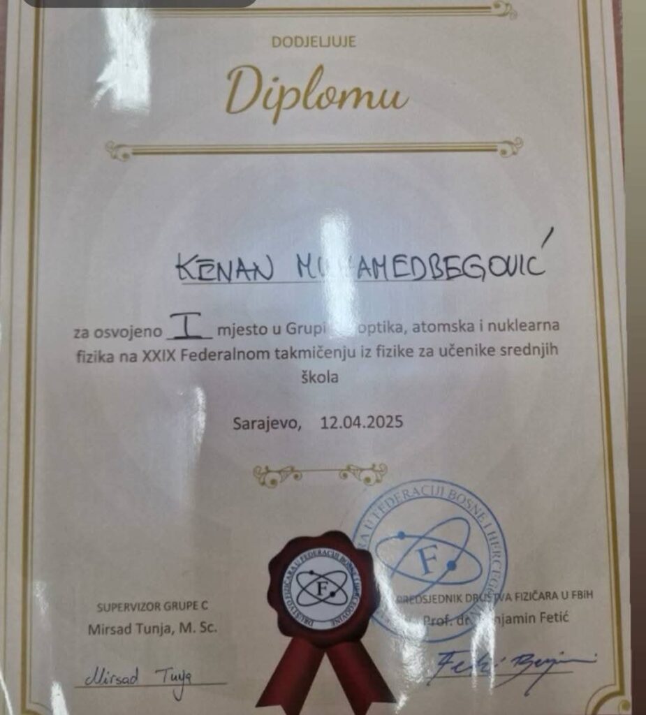 Kenan Muhamedbegović osvojio prvo mjesto na Federalnom takmičenju iz fizike