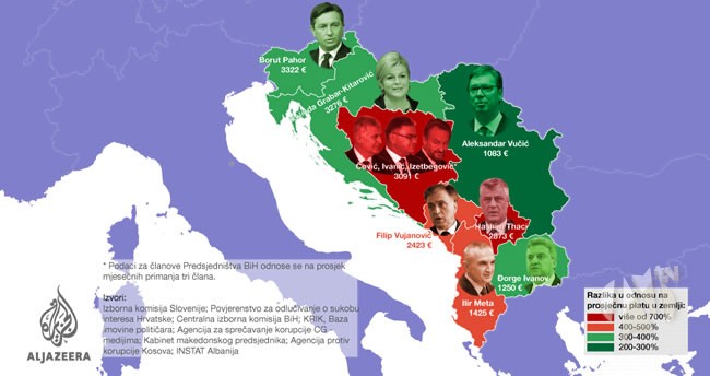 Ako predsjednička primanja poredimo s prosječnom plaćom u regiji, apsolutni su rekorderi predsjednik Kosova i članovi Predsjedništva Bosne i Hercegovine. Plaća Hashima Thacija gotovo je osam puta veća od prosječne, a tri člana Predsjedništva Bosne i Hercegovine primaju sedam puta više od prosjeka u toj državi.