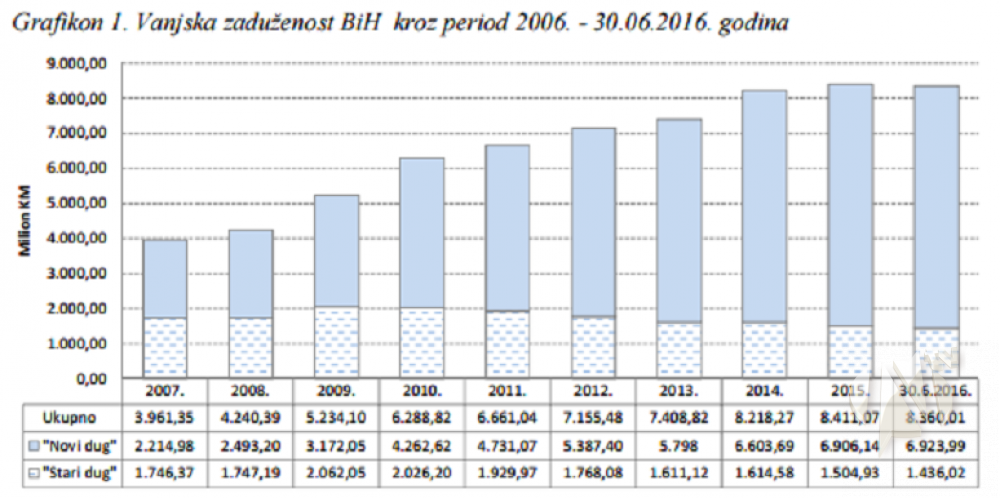 Prema podacima Ministarstva finansija i trezora BiH, ukupan vanjski dug naše zemlje iznosi 8,36 milijardi KM. Ovi podaci se odnose na period zaključno sa 30. junom prošle godine. Sasvim sigurno je da će ovi podaci biti značajno izmijenjeni, kada Ministarstvo finansija i trezora ažurira podatke zaključno sa 31. decembrom 2016. godine, jer će tada u naš vanjski dug ući i produženi aranžman sa Međunarodnim monetarnim fondom (MMF), u vrijednosti od oko milijardu maraka.