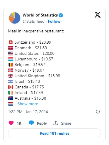 Na stranici World of Statistics objavljen je pregled cijena obroka u jeftinim restoranima po državama svijeta, a najskuplja je Švicarska s prosjekom od 28,99 dolara.