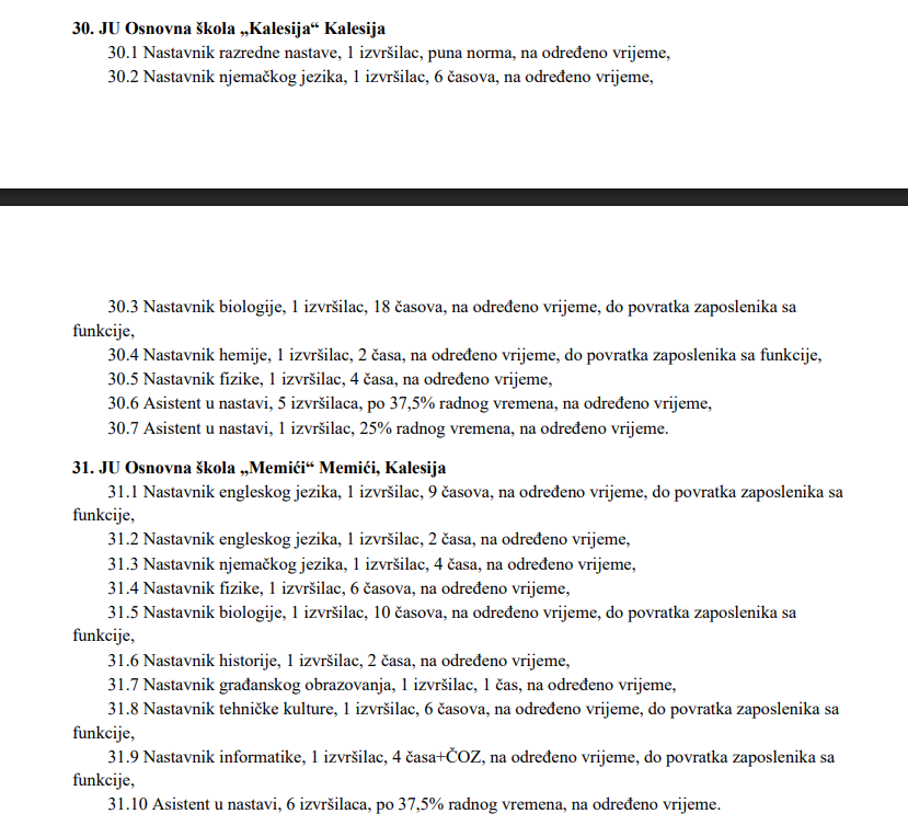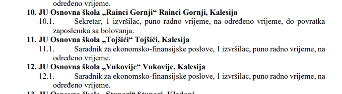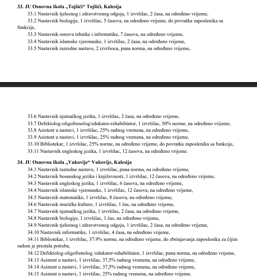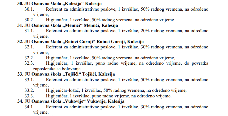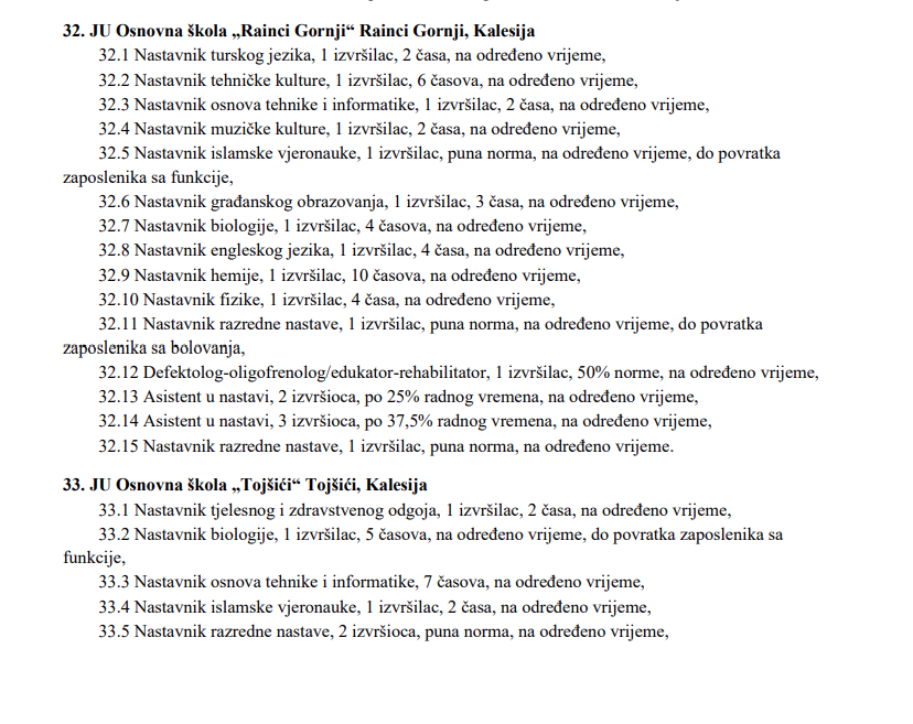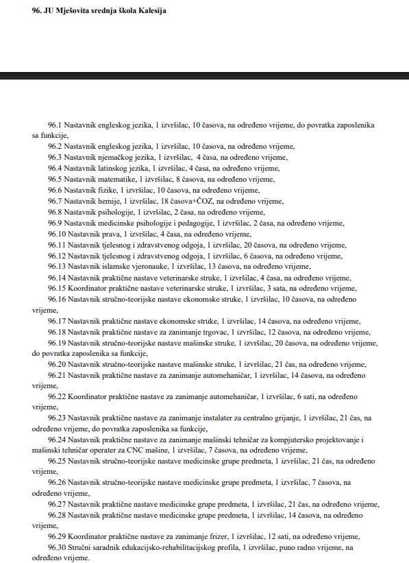 U nastavku pogledajte na koja radna mjesta/pozicije možete konkurisati kada je riječ o osnovnim i srednjim školama na području Kalesije.