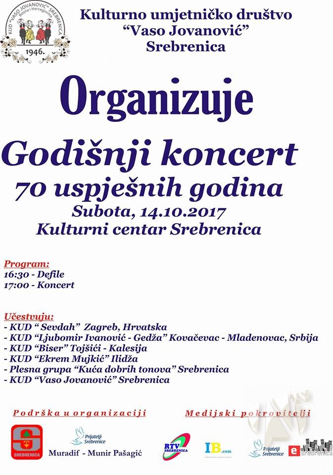 KUD “Vaso Jovanović” organizuje Godišnji koncert povodom 70 uspješnih godina postojanja i djelovanja. Koncert će se održati 14 oktobra 2017.godine u Kulturnom centru Srebrenica. Učešće na koncertu uzet će i KUD “Biser” Tojšići.
