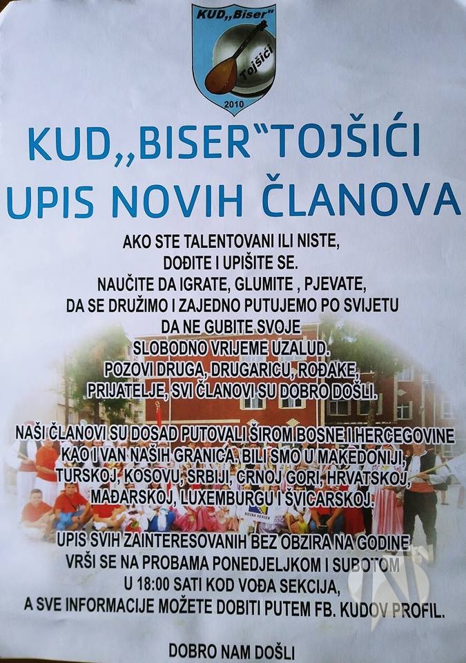 KUD “Biser” Tojšići nastavlja sa svojim aktivnostima, a u sklopu tih aktivnosti jeste i upis novih članova. Svi zainteresovani koji vole folklor, narodne igre, tradiciju i narodnu nošnju mogu se prijaviti ponedjeljkom i subotom u 18:00 sati i postati novi član KUD-a. Godine nisu bitne, najbitnije je da imate volju i želju da budete dio tima. Osim što ćete naučiti narodne igre, glumiti, pjevati sa KUD “Biser” Tojšići moći ćete putovati i upoznavati druge gradove, istraživati njihovu kulturu i tradiciju.