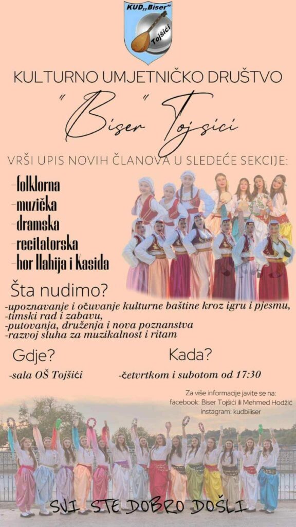 Kulturno-umjetničko društvo „Biser“ Tojšići poziva sve zainteresovane da se priključe njihovim sekcijama i postanu dio očuvanja i promocije kulturne baštine.