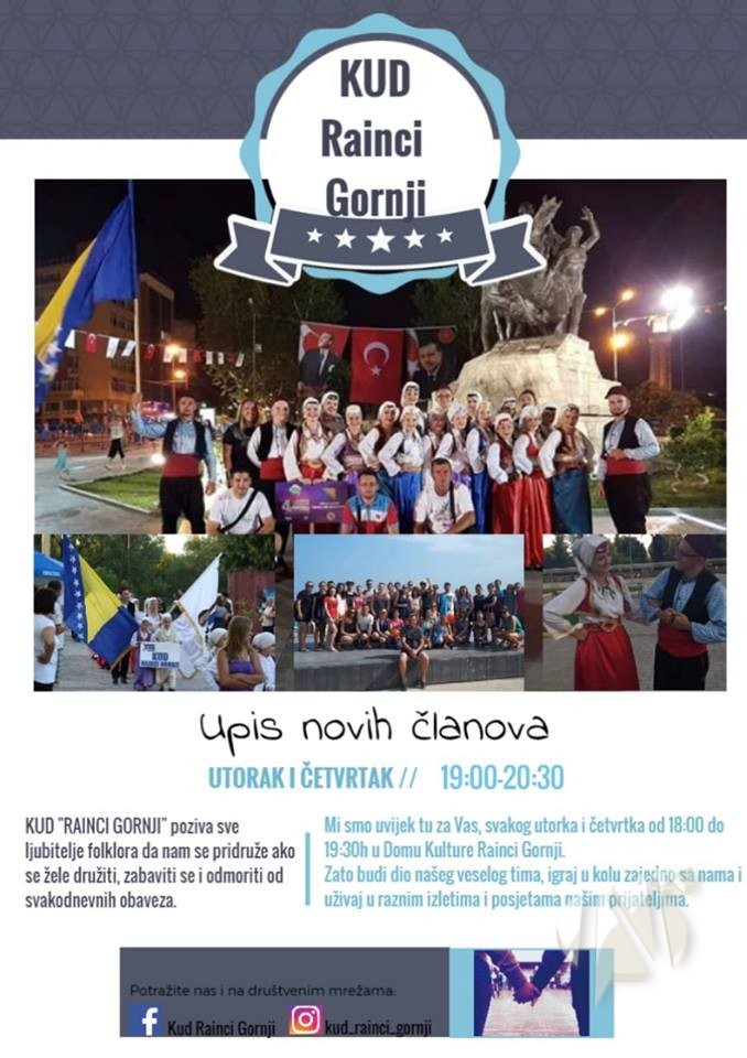 Učlaniti se u KUD “Rainci Gornji” možete utorkom i četvrtkom od 19:00 do 20:30 sati u Domu Kulture Rainci Gornji.
