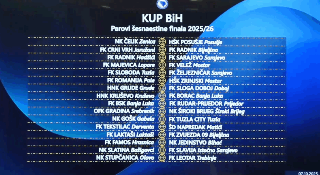 Žrijebanje parova šesnaestine finala Kupa Bosne i Hercegovine za sezonu 2025/26. održano je danas u prostorijama Nogometnog saveza BiH u Sarajevu.