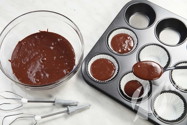 Sve zajedno miješajte električnom miješalicom (1 minutu) dok ne dobijete glatko tijesto. Tijesto kašikom rasporedite u kalupe za muffinse (8 kalupa).