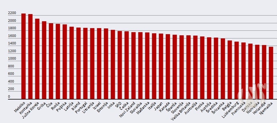 Prema metodologiji Organizacije za ekonomsku saradnju i razvoj (OECD), najviše sati godišnje rade stanovnici Meksika (2.246). Na drugom mjestu je Kostarika, gdje se u prosjeku radi 2.230 sati, a na trećem Južna Koreja, sa 2.113 sati rada.