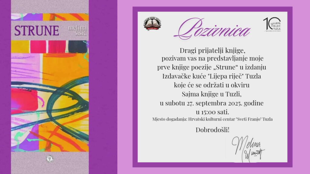 “Ovo je moja prva knjiga, objavljena ove godine, čije se prvo predstavljanje čitaocima planira u okviru sutrašnjeg programa Sajma knjige u Tuzli, od 15 sati u programu predstavljanja autora Izdavačke kuće “Lijepa riječ” Tuzla koja obilježava svečanih deset godina postojanja, čijem sam timu i glavnom uredniku Šimi Ešiću, našem istinskom heroju pisane/izgovorene riječi beskrajno zahvalna za divan prijem mog rukopisa i naravno, recenziju. Za likovni momenat u knjizi zahvaljujem se tuzlanskoj umjetnici Ameli Dubravić, čime je unesen poseban vizuelni identitet ritmičnosti i simbolike moga pisanja. Porodica i dragi prijatelji su bili moje prvo društvo sa kojim sam dijelila pjesme protekle tri godine. Na oduševljenje i riječi ohrabrenja pjesnika Ešića, otisnula sam se hrabrije u zapisivanje svojih stihova. Tako je nastala ova zbirka. Biti će mi posebno drago predstaviti svoju knjigu u subotu 27. septembra u Tuzli” kazala je za ntv.ba Melina Šišić