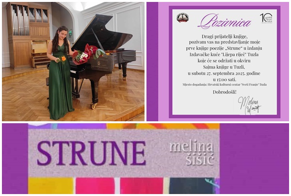 “Ovo je moja prva knjiga, objavljena ove godine, čije se prvo predstavljanje čitaocima planira u okviru sutrašnjeg programa Sajma knjige u Tuzli, od 15 sati u programu predstavljanja autora Izdavačke kuće “Lijepa riječ” Tuzla koja obilježava svečanih deset godina postojanja, čijem sam timu i glavnom uredniku Šimi Ešiću, našem istinskom heroju pisane/izgovorene riječi beskrajno zahvalna za divan prijem mog rukopisa i naravno, recenziju. Za likovni momenat u knjizi zahvaljujem se tuzlanskoj umjetnici Ameli Dubravić, čime je unesen poseban vizuelni identitet ritmičnosti i simbolike moga pisanja. Porodica i dragi prijatelji su bili moje prvo društvo sa kojim sam dijelila pjesme protekle tri godine. Na oduševljenje i riječi ohrabrenja pjesnika Ešića, otisnula sam se hrabrije u zapisivanje svojih stihova. Tako je nastala ova zbirka. Biti će mi posebno drago predstaviti svoju knjigu u subotu 27. septembra u Tuzli” kazala je za ntv.ba Melina Šišić