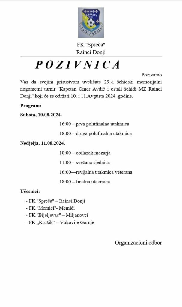 U organizaciji FK “Spreča” Rainci Donji održat će se XXIX Memorijalni turnir “Kapetan Omer Avdić i ostali šehidi MZ Rainci Donji”. Turnir će se održati 10. i 11. augusta. Prva utakmica, 10. augusta igra se sa početkom u 16:00 sati, a druga u 18:00 sati.
