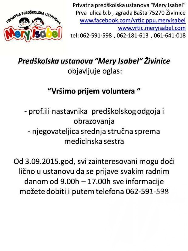 aaaaaaa-33Privatna predškolska ustanova “Mery Isabel” Živinice vrši prijem volontera i to: