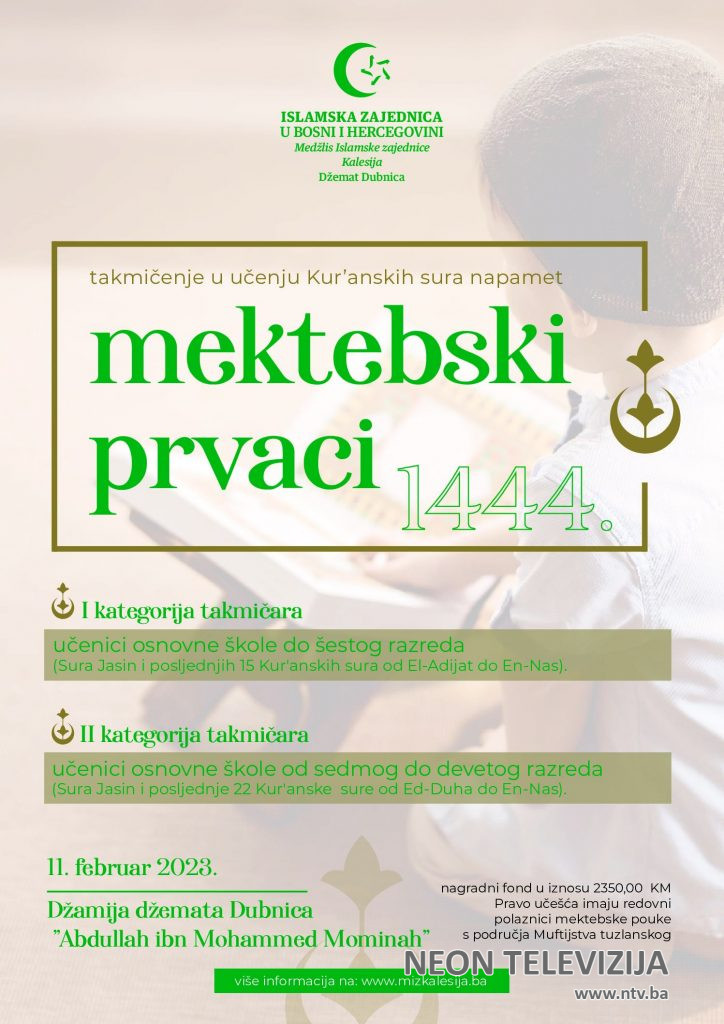 Medžlis Islamske zajednice Kalesija najavljuje organizaciju takmičenja „Mektebski prvaci 2023.“ u učenju Kur'anskih sura napamet, za redovne polaznike mektebske pouke.