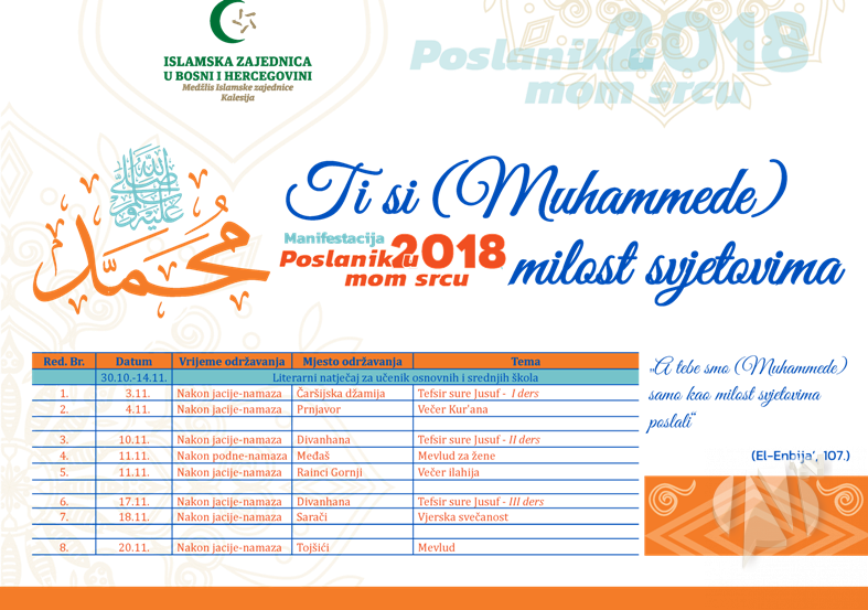 Moto ovogodišnje manifestacije je “Ti si (Muhammede) milost svjetovima”. Na ovu temu je raspisan literarni natječaj za učenike osnovnih i srednjih škola. Pored natječaja, u okviru manifestacije održat će se vjerski programi; večer Kur'ana, večer ilahija, predavanja, halke tefsira…