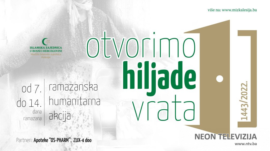 U džematima Medžlisa Islamske zajednice Kalesija ramazanska humanitarna akcija “Otvorimo 1.000 vrata” biće organizovana u periodu od 8. do 15. aprila 2022. god., odnosno tokom druge ramazanske sedmice.