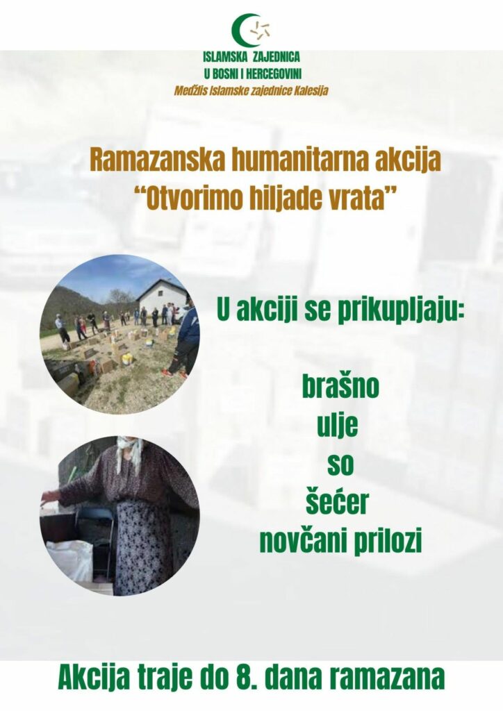 U džematima Medžlisa Islamske zajednice Kalesija ramazanska humanitarna akcija “Otvorimo 1.000 vrata” počela je prvog dana ramazana, a traje do osmog dana ramazana.