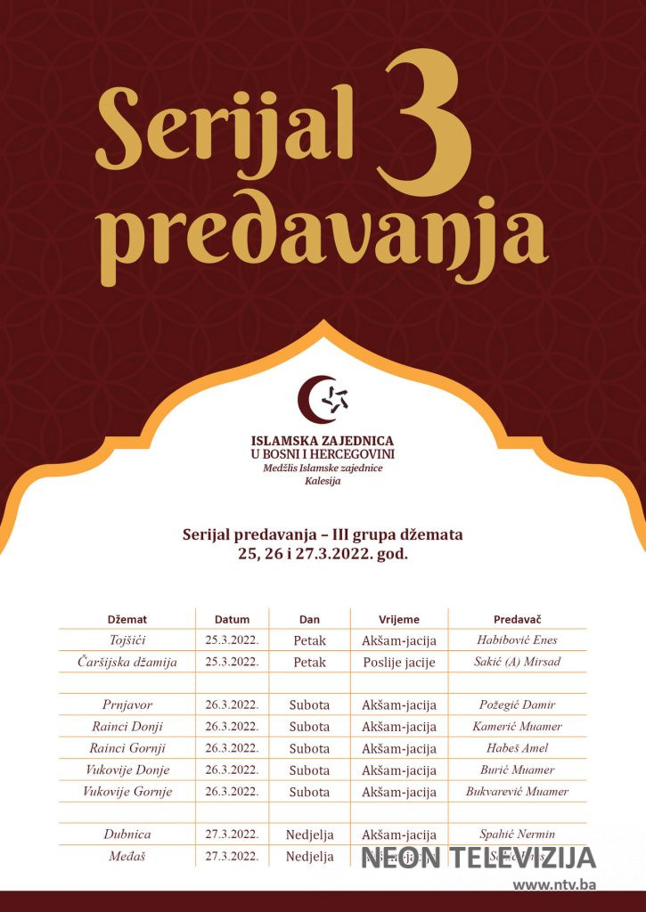 U petak, subotu i nedjelju, 25., 26., i 27. marta 2022. godine, održat će se predramazanska predavanja u devet džemata na području Medžlisa Islamske zajednice Kalesija.