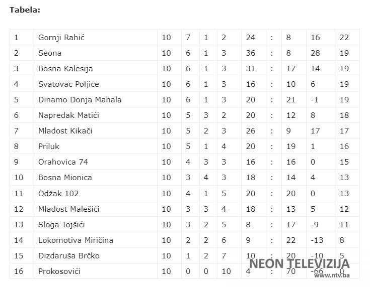 Nakon ovog kola Bosna je na trećoj poziciji sa 19 bodova, Mladost iz Kikača ima dva boda manje (17) na sedmom mjestu, dok je Sloga iz Tojšića trinaesta sa 11 bodova.