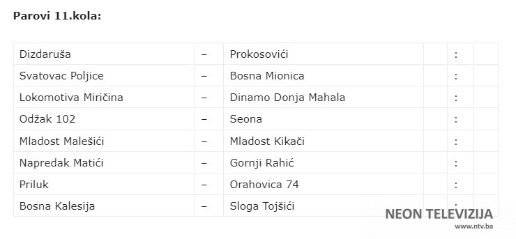 U narednom kolu na Gradskom stadionu u Kalesiji igra se lokalni derbi između Bosne iz Kalesije i Sloge iz Tojšića, dok će Mladost iz Kikača gostovati kod imenjaka iz Malešića.