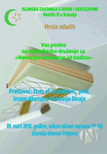 U okviru druženja Enes ef. Habibović, imam džemata Vukovije Donje, održat će halku hadisa na kojoj će tumačiti jedan od hadisa iz Nevevije zbirke 40 hadisa.
