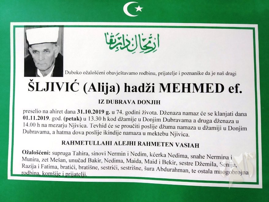 Dženaza-namaz će se klanjati danas, 1. novembra 2019. godine (petak), u 13.30 sati, kod džamije u Dubravama Donjim. S obzirom da je dan džume, druga dženaza-namaz će se klanjati u 14.00 sati na mezarju Njivica.