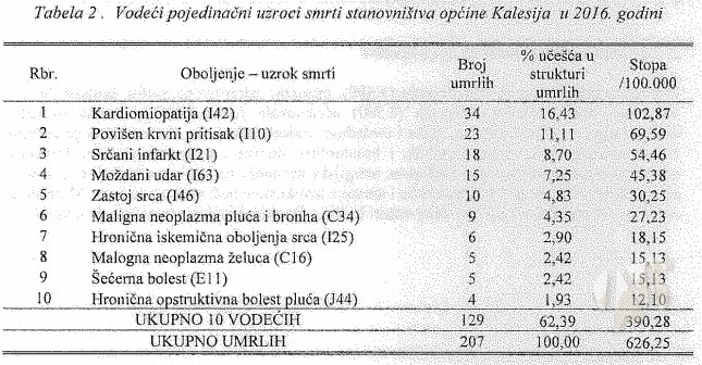 Među deset vodećih uzroka smrti stanovništva općine Kalesija, nalaze se bolesti cirkulatornog sistema (100-199), maligne neoplazme i hronična opstruktivna oboljenja pluća. Prema pojedinim dijagnozama prva tri vodeća uzroka smrti su: kardiomiopatija, povišen krvni pritisak i srčani infarkt. Ostali vodeću uzroci su: