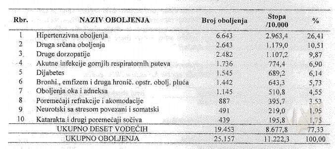 U ukupno registrovanom oboljevanju odraslog stanovništva od 19 i više općine (25.157), deset vodećih oboljenja (19.453) učestvovalo je sa 77,33%. Vodeći uzroci oboljevanja su: povišen krvni pritisak, srčana oboljenja, dorzopatije, akutne infekcije gornjih respiratornih puteva, šećerna bolest, bronhitis, emfizen i druga hronična obstruktivna oboljenja pluća, oboljenja oka i adneksa, poremećaji refrakcije i akomodacije oka, neurotski san sa stresom povezani i somatski poremećaji, te poremećaji očnog sočiva.