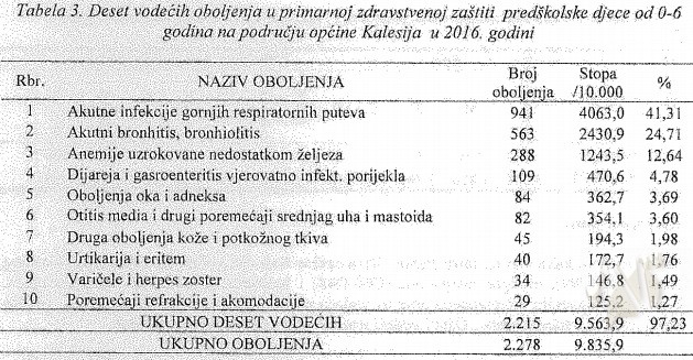 U ukupnom registrovanom oboljevanju (2.278), primarne zdravstvene zaštite djece predškolske dobi, deset vodećih oboljenja (2.215) učestvovalo je sa 97,23%. Prema stopama oboljevanja, na 10.000 djece predškolske dobi, vodeće bolesti su: akutne infekcije gornjih respiratornih puteva, akutni bronhitis i bronhiolitis, anemije uzrokovane nedostatkom željeza, dijarea i gastroenterokolitis, oboljenja oka i adneksa, upale i druge poremećaji srednjeg uha, oboljenja kože i podkožnog tkiva, alergijske promjene na koži, varičela i poremećaji refrakcije i akmodacije oka.