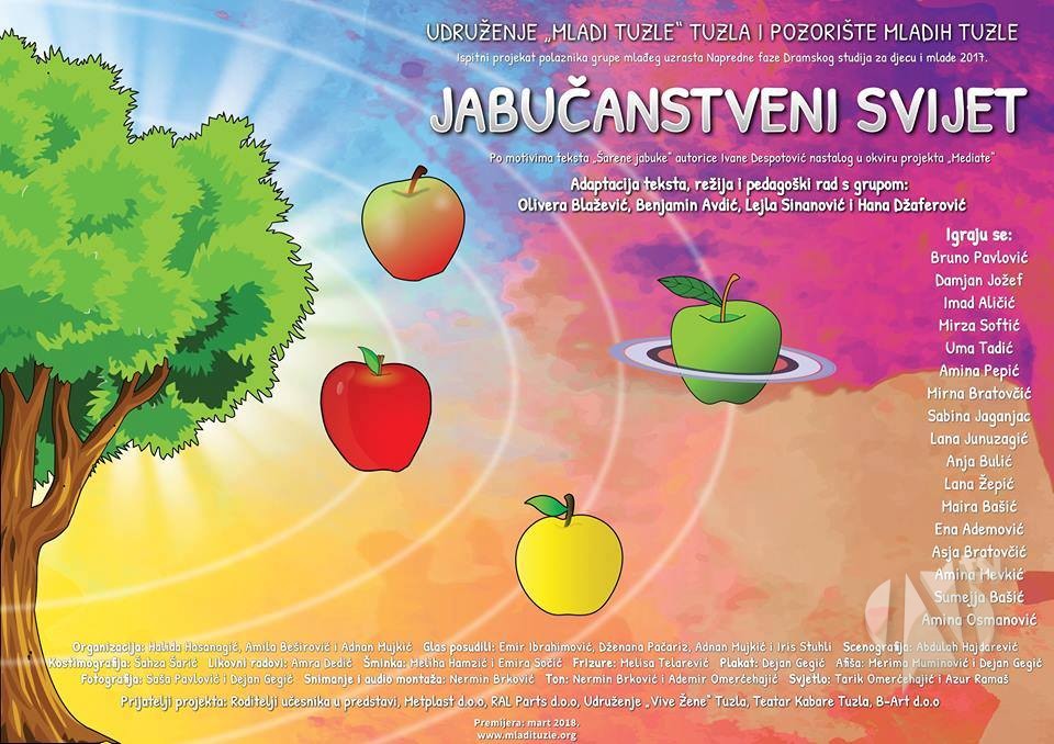 Predstava za djecu “Jabučanstveni svijet”, nastala u produkciji polaznika mlađe grupe Dramskog studija za djecu i mlade Pozorišta mladih Tuzla, premijerno će se izvesti u okviru programa ” 14. DANA MLADIH TUZLA”. Predstava će se odigrati u nedjelju, 4.3.2018. godine,  u 16.00 i 18.00 sati na sceni  Teatra Kabare Tuzla.