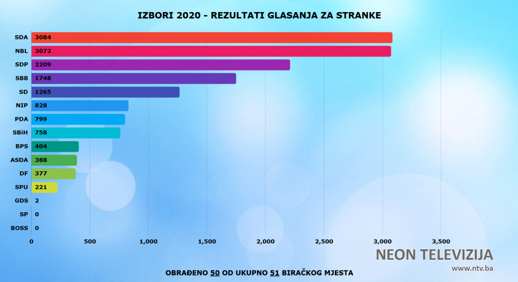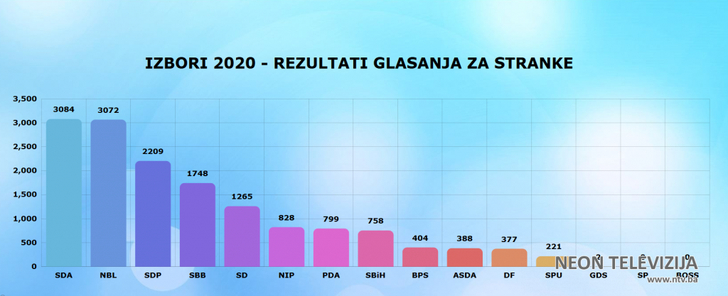 Prema prebrojanim glasačkim listićima sa 50 redovnih biračkih mjesta najveći broj glasova dobila je SDA 3 084, potom Nezavisno bosanskohercegovačka lista 3072. Nakon SDA i NBL slijede SDP,SBB,SD,NiP,PDA,SBiH. Sudeći prema rezultatima sa 50 biračkih mjesta osam stranaka prešlo je izborni prag.