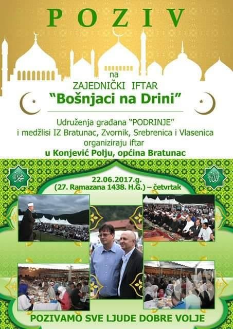 U bratunačkom naselju Konjević Polje, 22. juna ove godine, u organizaciji Udruženja građana Podrinje i medžlisa u Bratuncu, Zvorniku, Srebrenici i Bratuncu, bit će organizovan drugi po redu iftar pod nazivom „Bošnjaci na Drini“ na kojem će prisustvovati više od 7.000 postača iz cijele BiH. Nešto ranije 18.juna u sklopu manifestacije Dani Hasana Kaimije biće organizovan veliki iftar na stadionu Divič kod Zvornika gdje se takođe očekuje hiljade gostiju.