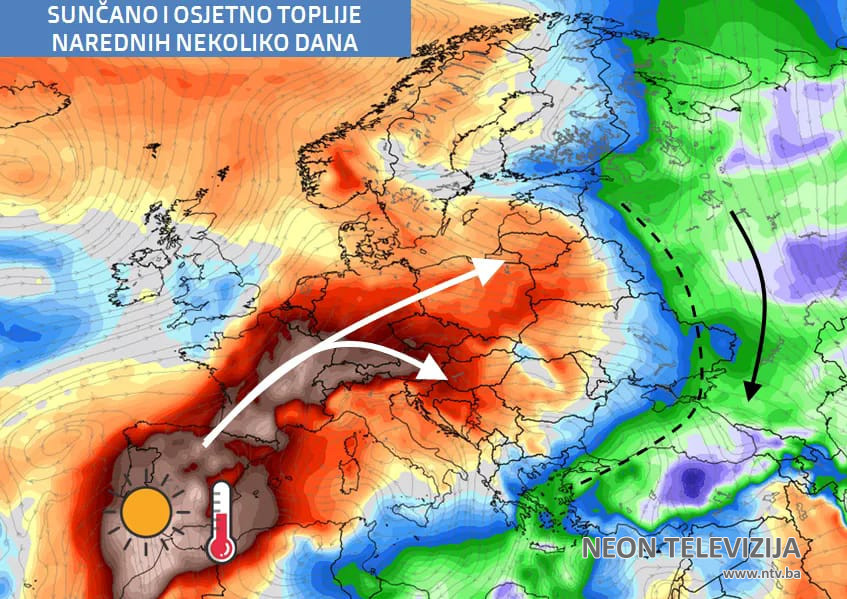 Danas u Bosni i Hercegovini sunčano vrijeme uz malu do umjerenu oblačnost. Po kotlinama i uz riječne tokove moguća je magla ili niska oblačnost. Vjetar slab do umjerene jačine sjevernog smjera. Jutarnja temperatura zraka većinom između 3 i 7, na jugu zemlje do 11, a najviša dnevna temperatura zraka uglavnom između 19 i 25, na jugu do 28 stepeni.
