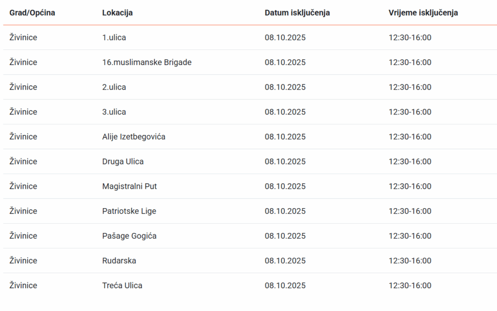 Nekoliko živiničkih ulica će sutra (8. oktobar) biti bez električne energije u periodu od 12:30 do 16:00 sati, saopćeno je iz Elektroprivrede Bosne i Hercegovine.