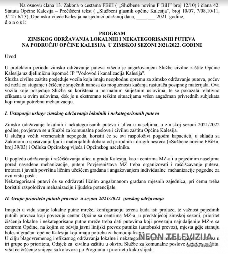S tim u vezi ovom prilikom želimo građanima Kalesije prezentirati Program za zimsko održavanje puteva u sezoni 2021/2022, koji je OV Kalesija usvojilo u septembru ove godine.