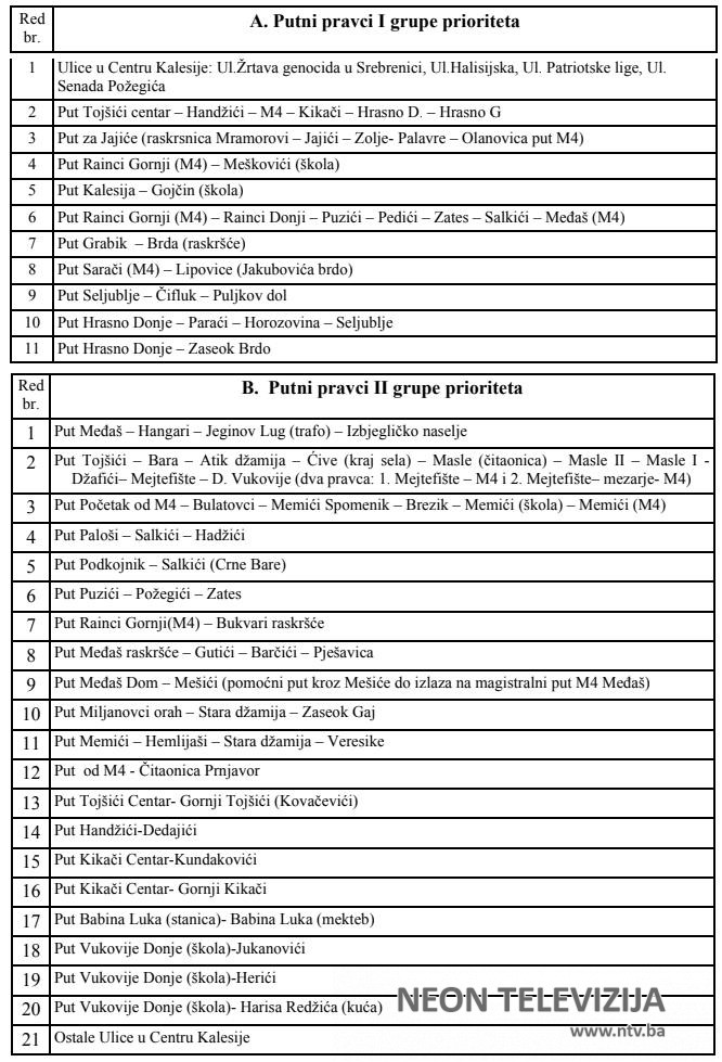 Naprimjer – u putne pravce I grupe prioriteta, i to na prvom mjestu, spada i Ulica Žrtva genocida u Srebrenici (kao i još neke ulice u centru Kalesije), a ova ulica je u opštem haosu dočekala početak radne sedmice, stoji u saopćenju NiP-a Kalesija.